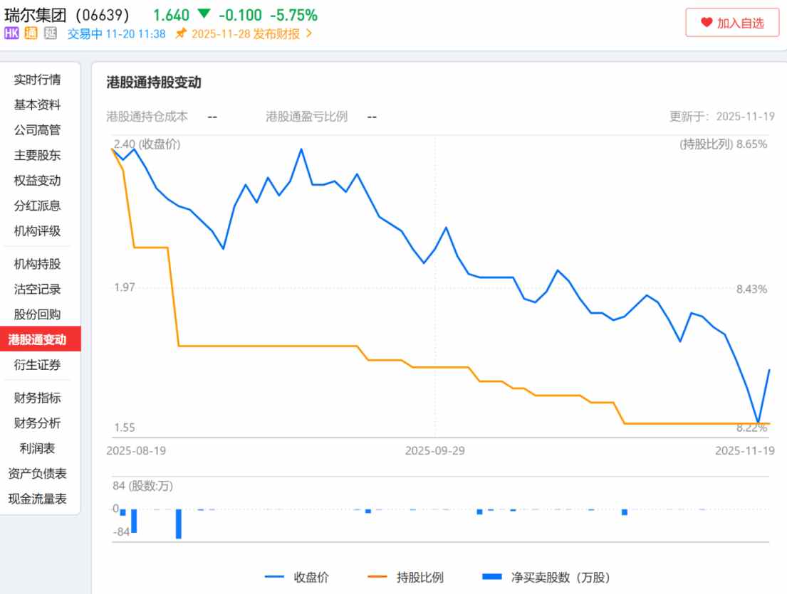 智通财经APP观察到,虽然早在今年3月10日至3月19日,瑞尔集团的港股通持股比例随其股价出现过明显下降,期间从11.48%降至10.24%,但此后港股通持股比例减持速度大幅减缓。尤其是今年9月后,随着公司股价持续下跌,场内的港股通资金已鲜有交易,持股比例仅减少0.11%。