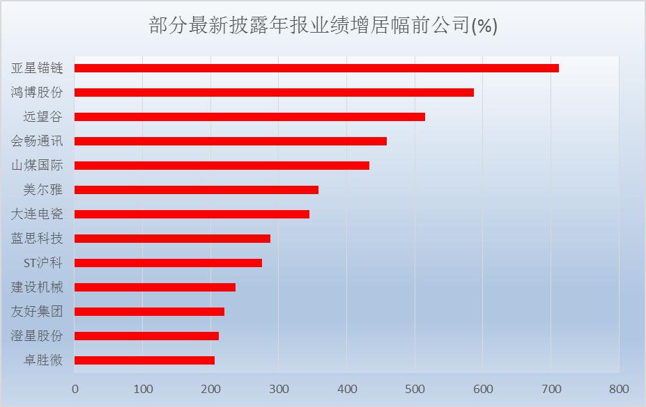 此外,远望谷(002161)、会畅通讯(300578)、山煤国际(600546)、美尔雅(600107)、大连电瓷(002606)2019年净利润同比增幅分别达515.14%、459.16%、432.80%、358.48%、345.30%,蓝思科技(300433)、ST沪科(600608)、建设机械(600984)、友好集团(600778)、澄星股份(600078)、卓胜微(300782)2019年净利润同比增幅也均超过200%。