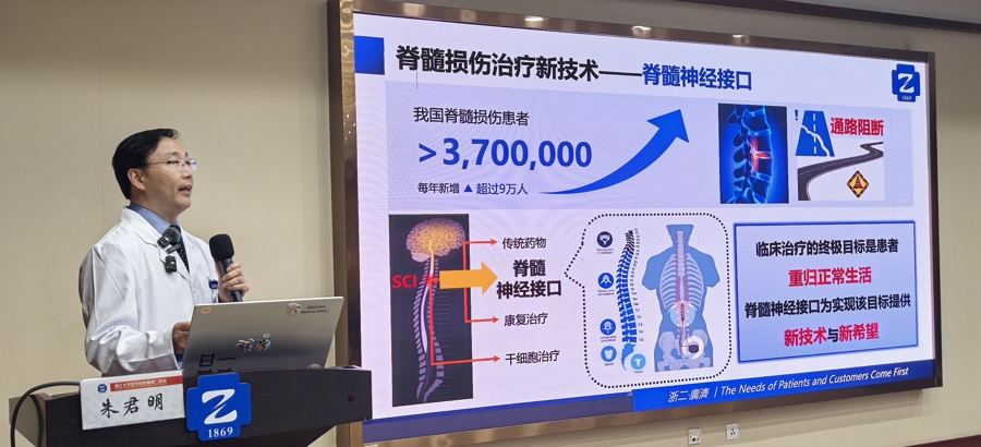 实验室成员、附属第二医院主任医师朱君明解释到:“如果把脊髓上的信号传导比作高速公路,金大叔的脊髓损伤情况就像高速公路遭到了破坏导致大部分车道无法通行,我们团队采用的脊髓神经接口技术就好比修复受损道路,重新增强了车辆通行能力。”