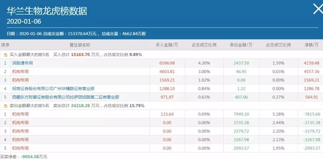 在A股正迎来开门红之际,2019年悄然翻倍的潍柴动力1月6日放量大跌近8%,涪陵榨菜盘中跌逾4%,机构抱团最爱的高价股贵州茅台新年开市后连续三个交易日跌逾千亿。6日医药大白马华兰生物更是重挫7.98%,市值蒸发超30亿元。龙虎榜数据显示机构账户博弈剧烈。昨天机构专用账户占据了龙虎榜两席买入席位和全部卖出席位。其中,五个机构卖出席位合计卖出2.13亿元。