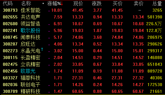消费电子概念今日盘中小幅走高,截至收盘,佳禾智能涨停,共达电声、领益智造涨约7%,歌尔股份、闻泰科技涨逾5%。