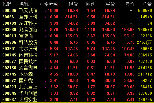 芯片概念股今日盘中走势活跃,截至收盘,飞天诚信、圣邦股份、左江科技等涨停,兆易创新逼近涨停,富瀚微涨近9%,科达股份、韦尔股份、闻泰科技、国民技术等涨幅超5%。