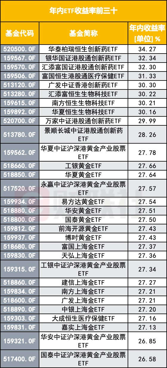 此外,多只黄金ETF收益率居前,如工银黄金ETF、华夏黄金ETF、易方达黄金ETF、华安黄金ETF、国泰黄金ETF等,年内收益均超27%。(如下图)
