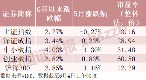 A股主要股指5月及6月涨跌幅及最新估值