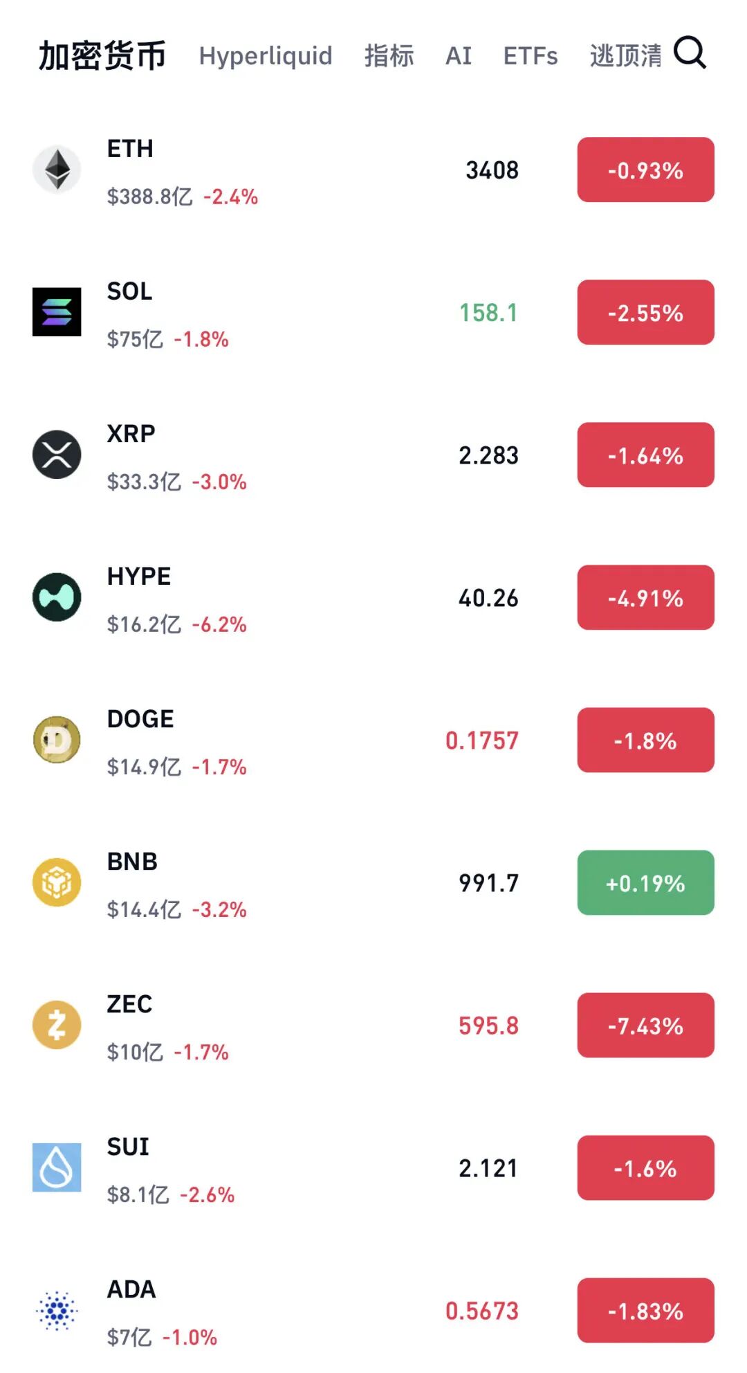 其他虚拟货币大多数复刻这种走势,截至发稿,以太坊跌近1%,HYPE币跌近5%,狗狗币跌近2%。