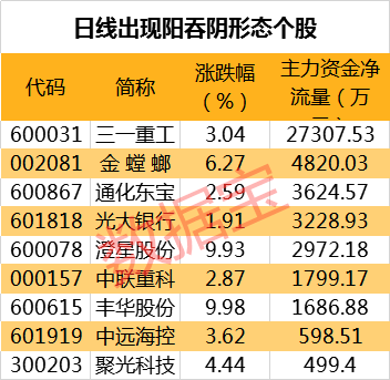 截至最新收盘,两市共有37只个股日K线出现阳吞阴形态,当天涨幅最大的是丰华股份、澄星股份、金螳螂,涨幅分别为9.98%、9.93%、6.27%。