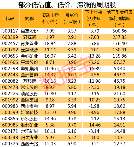钢煤等周期股大涨,19只周期股低估值、低价且滞涨。