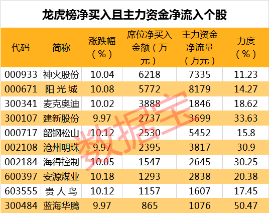 从盘口资金流向来看,主力资金净流入超千万且龙虎榜净买入个股共有11只,其中阳光城、神火股份、韶钢松山等个股资金净流入金额最大。净流入力度最大的个股有蓝海华腾、建新股份、沧州明珠,净流入力度分别为50.47%、33.63%、30.9%。