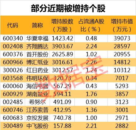其中齐翔腾达被增持的股数最多,达3903.67万股,占流通A股比例为2.24%;华夏幸福被增持的市值最多,达3.91亿元;而增持股数占流通A股比例较高的公司为博汇纸业,增持比例高达2.26%。