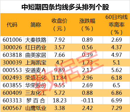 最新数据显示,截至11月25日,66只个股5日、10日、20日、60日四条均线近日呈多头排列。其中大秦铁路、红日药业、曲美家居股价与60日均线的乖离率最小,分别为2.69%、4.37%、4.97%。