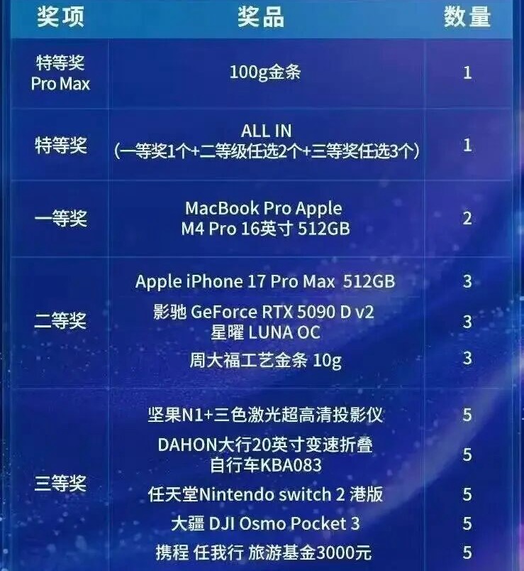 有“广州米哈游”之称的库洛游戏今年奖品也有所升级,头等奖“金色传说”是一台价值超过1.5万的iMac,第二大奖项包括10克的周大福金条、iPhone 17 Pro等,价格超过1万元。