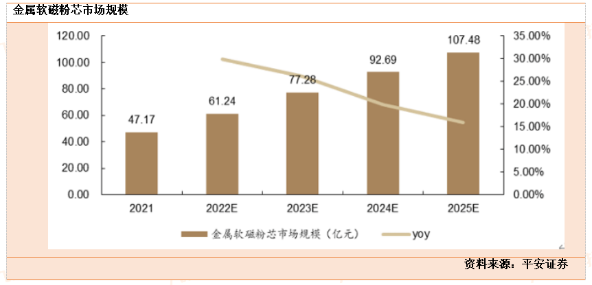 综上所述,在充电桩和新能源汽车齐齐放量的情况下,预计金属软磁粉芯到2025年,市场规模可达8.1亿元。2021-2025年复合增速共39.98%。