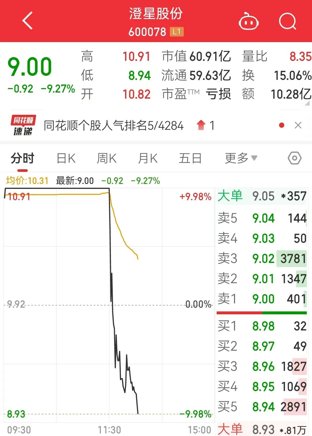 午后突然跳水600078由涨停飘绿!