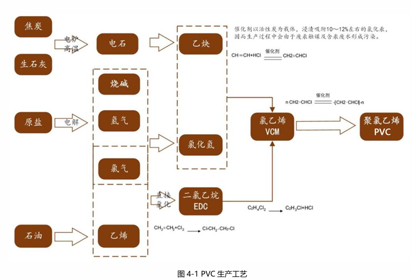 PVC的生产工艺主要有两条路线:石油路线和电石路线。两条路线最后都要用到氯乙烯单体(VCM)生产PVC,不同之处在于生产VCM的方法不同。除中国外的世界其他国家一般采取石油路线,即利用石油炼化产品为原料生产PVC,主要是从石油中提取乙烯(C2H4),让氯气与乙烯发生取代反应,制得氯乙烯单体,经聚合反应生成PVC树脂,又称乙烯法PVC。电石路线是利用电石(碳化钙CaC2),遇水生成乙炔(C2H2),将乙炔与氯化氢(HCl)合成制出氯乙烯单体(CH2CHCl),再通过聚合反应使氯乙烯生成PVC,称乙炔法PVC。