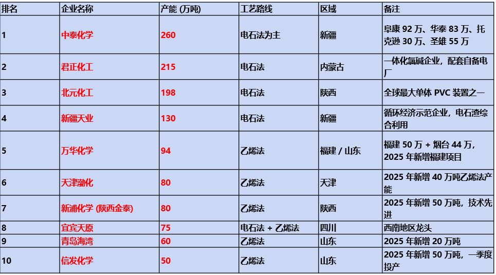 行业PVC产能情况:总产能2993万吨(占全球约47%),同比增7.35%;电石法占72%、乙烯法占28%;西北占比43%为第一大产区;CR5约45%,中泰化学居首;2025年净增205万吨,2026年扩能基本收官。中泰化学(260万吨)、新疆天业(134万吨)、君正集团(80万吨)、氯碱化工(48万吨)、嘉化能源(30万吨)、三友化工(52.5万吨)、凯立新材(PVC无汞催化剂龙头)。