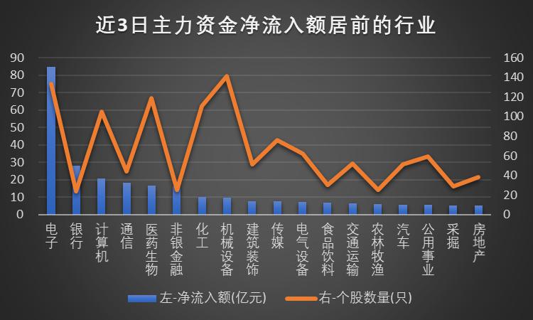 时隔一月之久,上证综指终于再次迎来日线三连阳。向来嗅觉敏锐的主力资金自然不会错过这波反弹。据数据统计,剔除近期新股及停牌股,近三日,两市共有1455只股票实现主力资金净流入,占比41%,合计净流入292.03亿元。