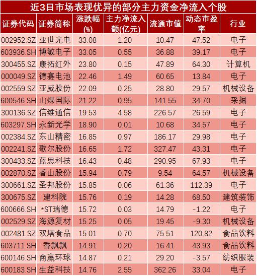 从市场表现来看,科技股更是一骑绝尘,近3日累计涨幅居前的个股几乎被科技股霸榜。例如,排名前十的个股中,亚世光电(002952)(33.08%)、博敏电子(603936)(33.05%)、康拓红外(300455)(23.80%)、德赛电池(000049)(22.46%)、信维通信(19.53%)、永新光学(603297)(18.90%)、东山精密(002384)(16.85%)、歌尔股份(002241)(16.65%)占据了8席。即便将榜单放宽到涨幅前100位,科技股依然强势,共有57股入榜,占比近60%。