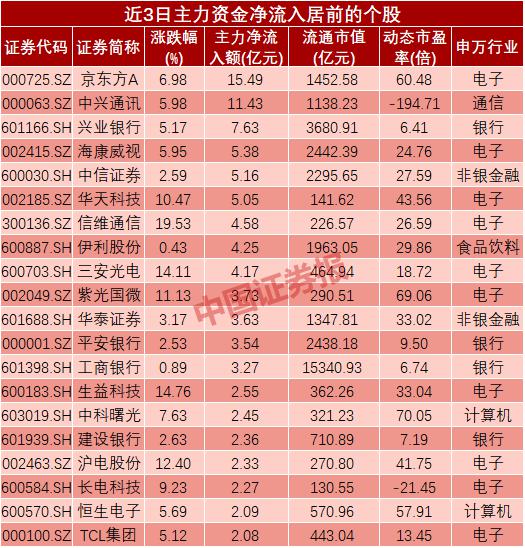具体到个股来看,科技股一马当先,近3日主力资金累计净流入前20位的个股中,科技处占据了17个席位。其中,OLED概念龙头股京东方A居首,净流入额高达15.49亿元;5G概念领头羊中兴通讯居次,净流入11.43亿元;此外还有海康威视(002415)、华天科技(002185)、信维通信(300136)等科技股排名靠前。