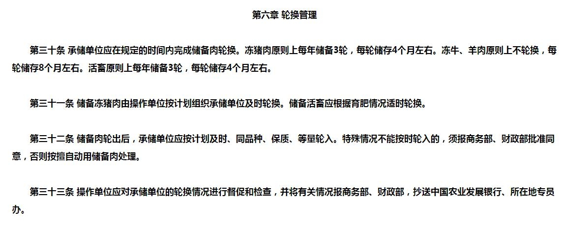 《中央储备肉管理办法》提到,储备肉是指国家用于应对重大自然灾害、公共卫生事件、动物疫情或者其他突发事件引发市场异常波动和市场调控而储备的肉类产品。储备肉包括两部分,一是储备的活畜(含活猪、活牛、活羊),二是储备的冻肉(含冻猪肉、冻牛肉、冻羊肉)。