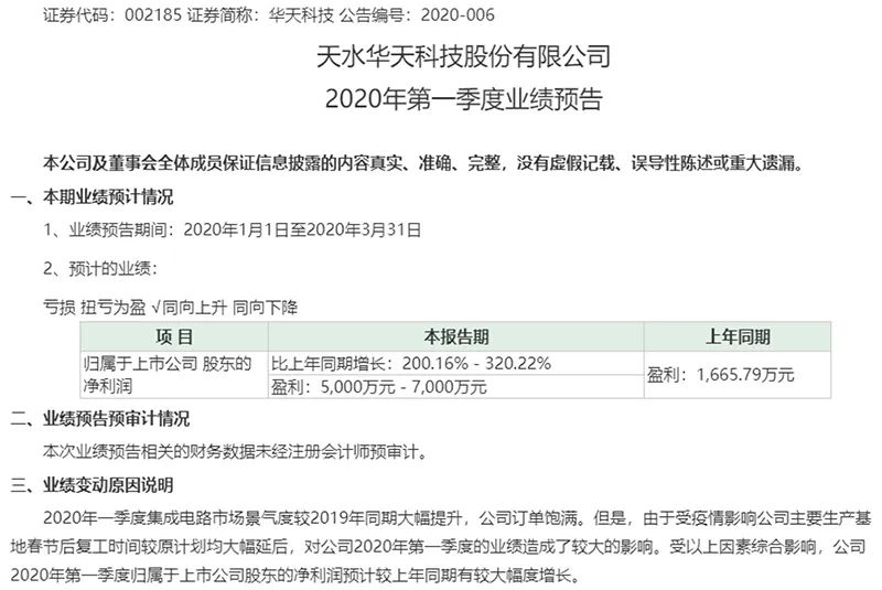 与这位业内人士的反馈相互印证的是,华天科技最新披露,由于订单饱满,预计一季度业绩增长200.16%至320.22%。