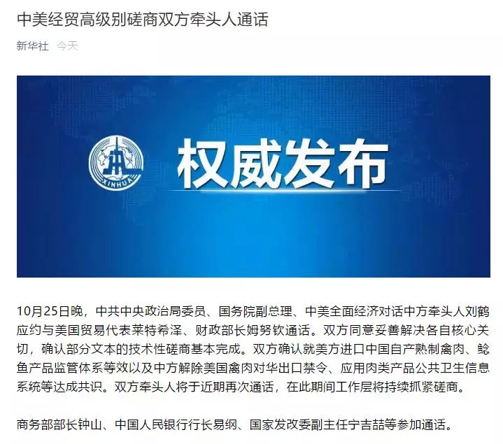 10月25日晚,中共中央政治局委员、国务院副总理、中美全面经济对话中方牵头人刘鹤应约与美国贸易代表莱特希泽、财政部长姆努钦通话。双方同意妥善解决各自核心关切,确认部分文本的技术性磋商基本完成。