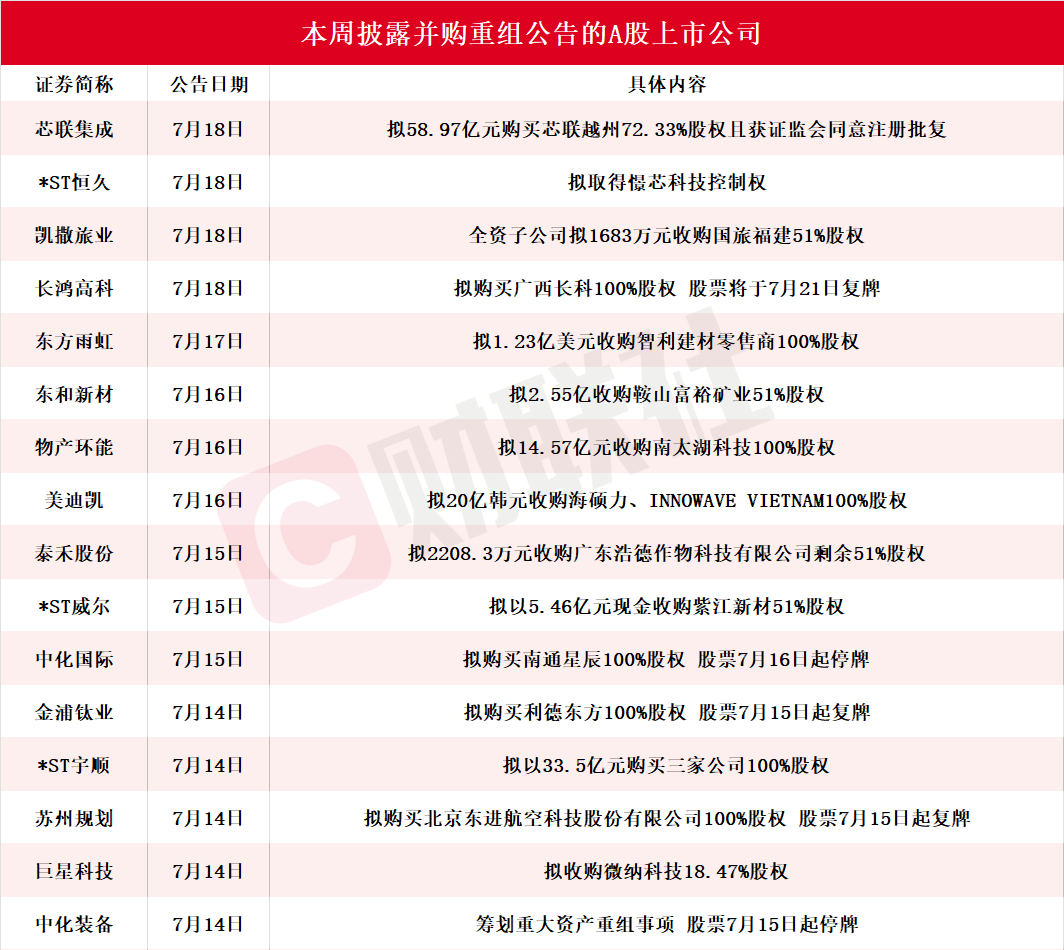 据不完全统计,截至发稿,本周披露并购重组进展的A股上市公司共有16家,包括芯联集成、*ST恒久、凯撒旅业、长鸿高科、东方雨虹、东和新材、物产环能、美迪凯、泰禾股份、*ST威尔、中化国际、金浦钛业、*ST宇顺、苏州规划、巨星科技和中化装备,具体情况如下图: