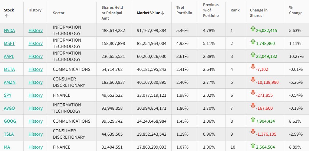 苹果(AAPL.US)位列第三,持仓2.37亿股,持仓市值约602.6亿美元,占投资组合比例为3.61%,较上季度持仓数量增长10.2%。