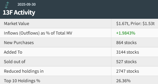 据统计,摩根大通第二季度持仓总市值为1.67万亿美元,上一季度总市值为1.53万亿美元。该基金在第三季度的投资组合中新增了864只个股,增持了3144只个股,减持了2747只个股,清仓了527只个股。其中前十大持仓标的占总市值的26.36%。