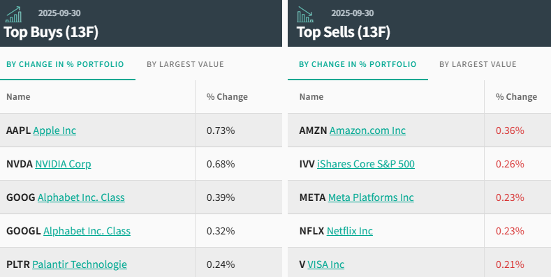 前五大卖出标的包括:亚马逊、iShares核心标普500ETF (IVV.US)、META、奈飞(NFLX.US)和Visa(V.US)。