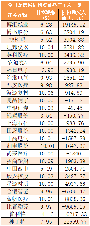 盘后龙虎榜数据显示,机构现身27股,其中博汇纸业等10股呈现机构资金净买入,搜于特等17股呈现机构资金净卖出。
