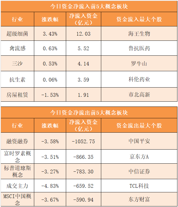 概念板块方面,今日超级细菌、禽流感、三沙、抗生素等概念板块资金呈现净流入,其中超级细菌概念净流入12.03亿元居首。