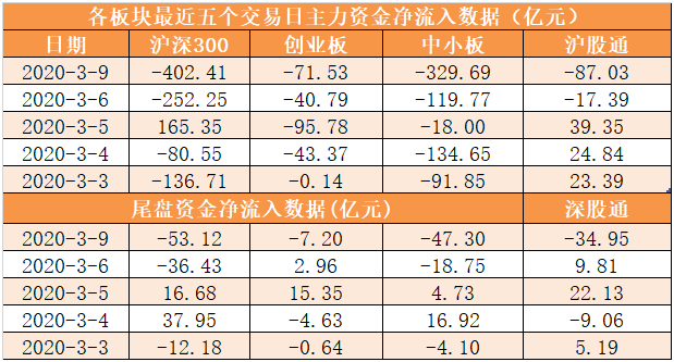 沪深300今日主力资金净流出402.41亿元,创业板净流出71.53亿元,中小板净流出329.69亿元。沪股通净流出87.03亿元,深股通净流出34.95亿元(本文中沪股通、深股通净流入额以当日已用额度来计,与成交净买入额略有差异,但表示的意义大体一致)。