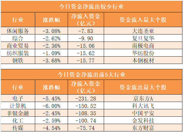28个申万一级行业中,无一行业实现资金净流入,电子、计算机、非银金融、化工等行业资金净流出规模居前,其中电子行业净流出231.28亿元居首。