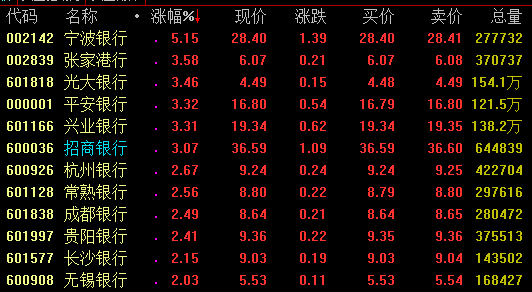 银行板块今日盘中震荡走高,截至发稿,宁波银行涨幅超5%,张家港行、光大银行、平安银行、兴业银行、招商银行等涨幅超3%。