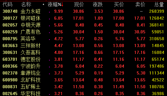 稀土板块今日盘中震荡上扬,截至发稿,金力永磁涨停,银河磁体涨近7%,中钢天源、广晟有色幅超5%,英洛华、三祥新材涨幅超4%。