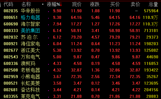 家电板块今日盘中大幅拉升,截至发稿,华帝股份涨停,格力电器涨逾9%,海尔智家涨约8%,美的集团、苏泊尔、海信家电涨幅超6%。