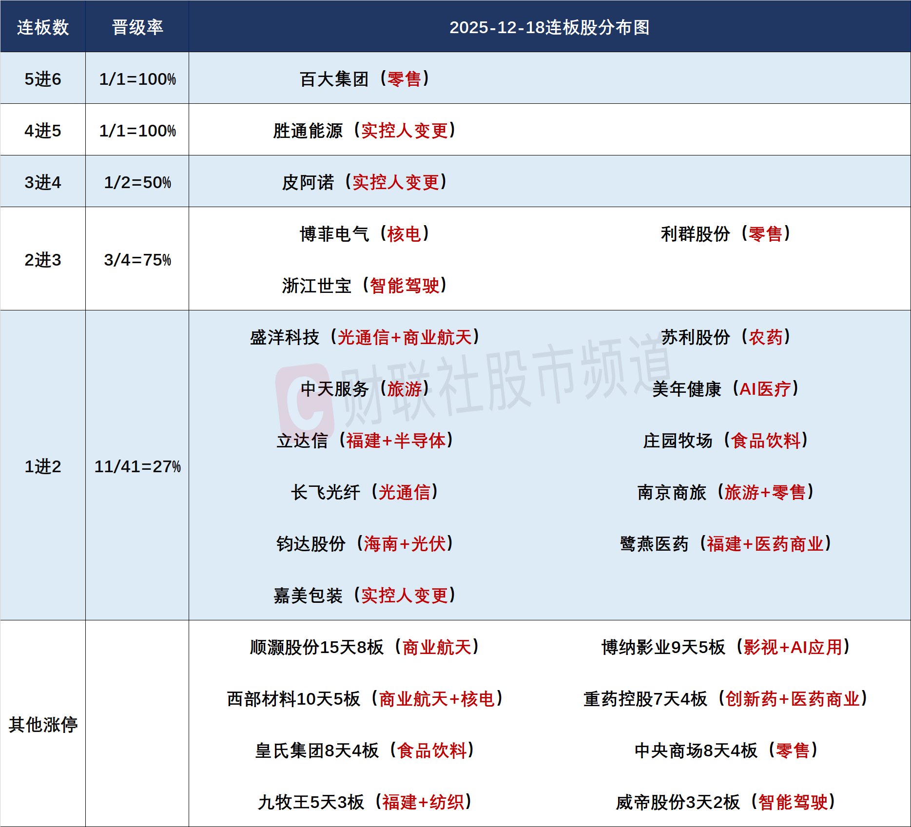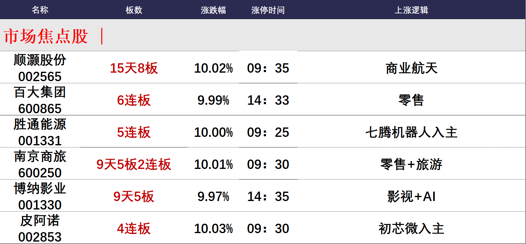 板块方面,商业航天概念股反复活跃,顺灏股份15天8板、西部材料10天5板、盛洋科技2连板,北交所星辰科技30CM涨停,权重中国卫星也一度触及涨停;大消费板块延续强势,百大集团6连板、南京商旅9天5板、利群股份3连板,此外犒赏经济概念异军突起,德艺文创、浪莎股份、一心堂等个股涨停,消息面上,《学习时报》发表文章《何为“犒赏经济”》指出,一种被称为“犒赏经济”的新型消费模式在年轻群体中悄然兴起并迅速发展,成为拉动内需、扩大消费的新引擎。