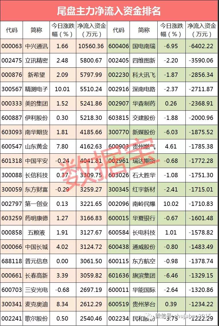 尾盘有6只个股资金流入超5000万元,中兴通讯是唯一尾盘资金流入超亿元个股,净流入1.06亿元。尾盘半小时,中兴通讯出现加速上涨,最终收涨1.66%。消息面上,中兴通讯独家中标中国移动2019年至2020年NFV彩信中心设备集采。立讯精密尾盘资金流入5800万元;新希望尾盘流入5797万元。