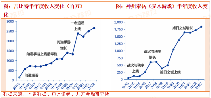 由于长周期产品本身的稀缺性,大部分游戏公司都是波浪式增长,台阶式增长的代表公司为腾讯、网易、吉比特等。对比吉比特(《问道》支撑),壳木游戏(《旭日之城》《战火与秩序》支撑)亦呈现台阶式增长态势。
