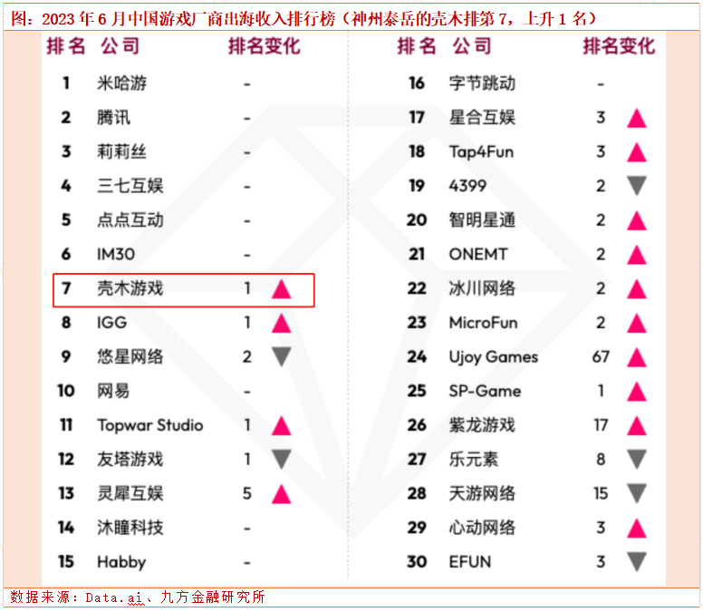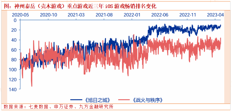 产品结构上,以SLG为主,主要市场为北美、日本、韩国等,海外收入占比持续超 过80%,其中2022 年海外营收占比约87%。根据Data.ai的数据,中国手游发行商出海月收入排行榜中壳木游戏稳居 top10,公司的重点产品《旭日之城》和《战火与秩序》分 别位于23年4月中国厂商出海收入第9名和第24名。