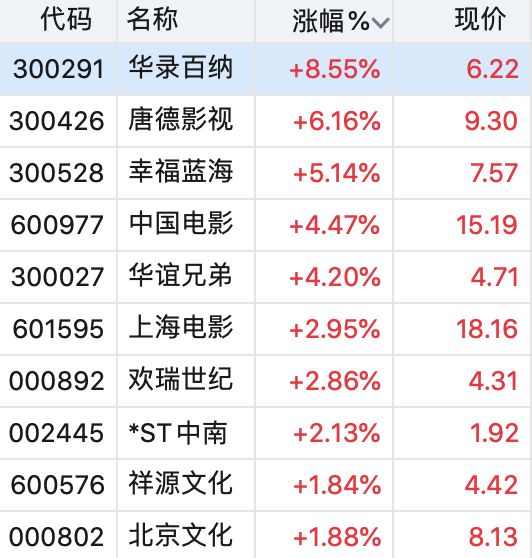 A股市场上,影视股今日早盘同样表现活跃,截至发稿,板块内概念股华录百纳涨超8%,唐德影视涨超6%,幸福蓝海涨超5%,中国电影、华谊兄弟、上海电影同样涨势喜人。