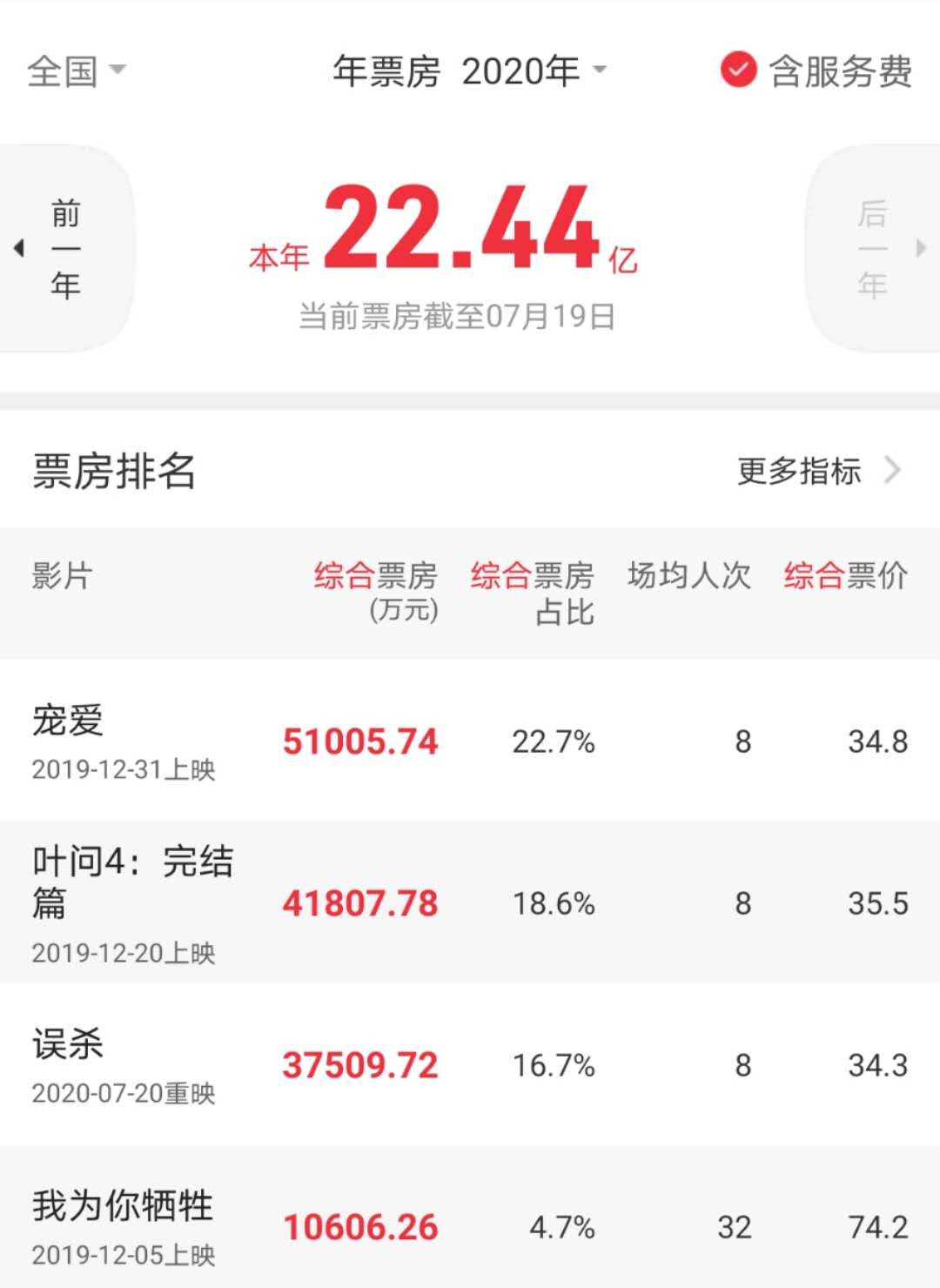 猫眼电影数据显示,截至2020年7月19日,中国今年累计票房仅22.44亿元。