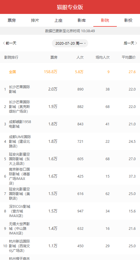 根据猫眼电影数据,截至7月20日10时38分,全国影院复工首日票房已经达158.8万,观影人次5.8万人。