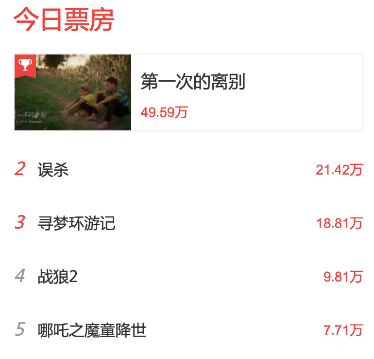 根据猫眼电影数据,截至7月20日10时38分,全国影院复工首日票房已经达158.8万,观影人次5.8万人。其中,由大象纪录、腾讯影业、芒果TV、易腾影视、上海桥溪、峨影集团联合出品的家庭亲情片《第一次的离别》暂居票房榜首。