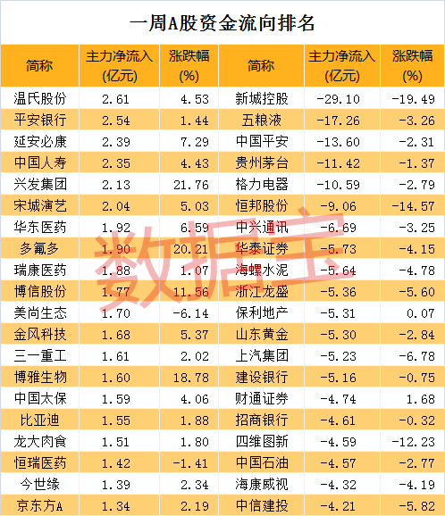 个股方面,不含近一个月上市的次新股,本周28股主力资金净流入超亿元。净流入规模最大的是温氏股份,本周主力资金净流入2.61亿元,该股本周上涨4.53%。平安银行、延安必康主力资金净流入分别为2.54亿元、2.39亿元,本周分别上涨1.44%、7.29%。本周净流入规模较大还有的中国人寿、兴发集团、宋城演艺、华东医药、多氟多等。