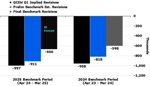 首先,今晚的一大重头戏还是对截至2025年3月底的12个月里的就业数据的进一步修正。随着每年1月就业报告的发布,美国劳工统计局会将就业数据与更精准但不够及时的季度就业与工资普查(QCEW)数据进行基准校准。该数据基于各州失业保险税记录,覆盖美国大部分就业岗位。