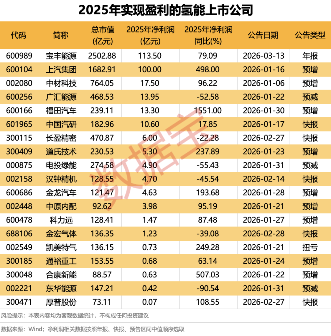 据证券时报·数据宝统计,截至3月16日,已有35家风电设备上市公司发布2025年业绩相关报告。以年报、快报数据或预告中值统计,共计19家氢能公司2025年实现盈利。