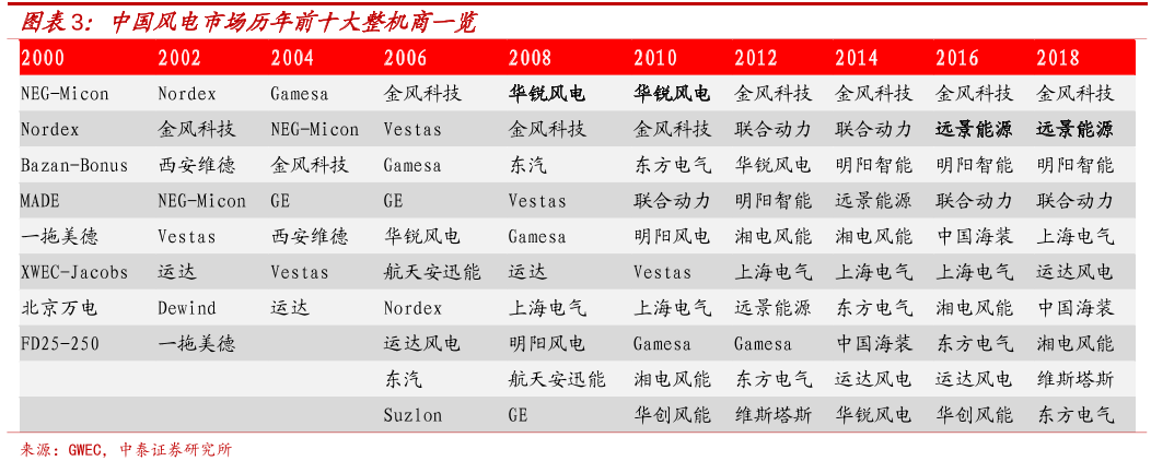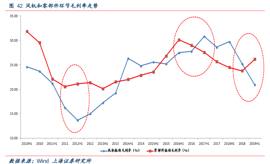 整机厂商明年迎来拐点:那么,为什么金风科技今年的业绩没有明显上升呢,因为风机的业绩落后于风电零部件。从生产周期来看,整机订单签订与制造时间通常有12-18个月间隔,因此整机毛利率提升通常会更加滞后。从历史数据看,2014-2015年风电大规模并网,导致2015-2016年弃风率上升,零部件厂商的毛利率在2016年就已经见顶,而整机厂商毛利率2017年才见顶。类似的情形发生在2011-2012年,零部件厂商也先于整机出现拐点;同理,这一轮的抢装周期对整机的影响也将在明年体现出来。可以这么说,今年风电零部件的业绩有多好,明年风机整机的业绩就只会更好。