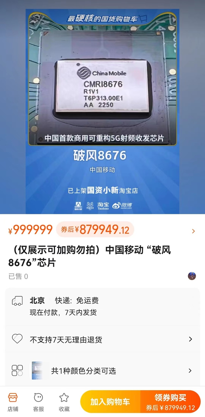 10月30日,第一财经记者发现一款编号为CMRI8676的5G芯片上架淘宝商城。商品图介绍称该款芯片名为“破风8676”,是“中国首款商用可重构5G频射收发芯片”,定价人民币999999元。这款芯片因独特的用途和“硬核”的定价被网友戏称为“双十一”期间最“硬核”的国货。