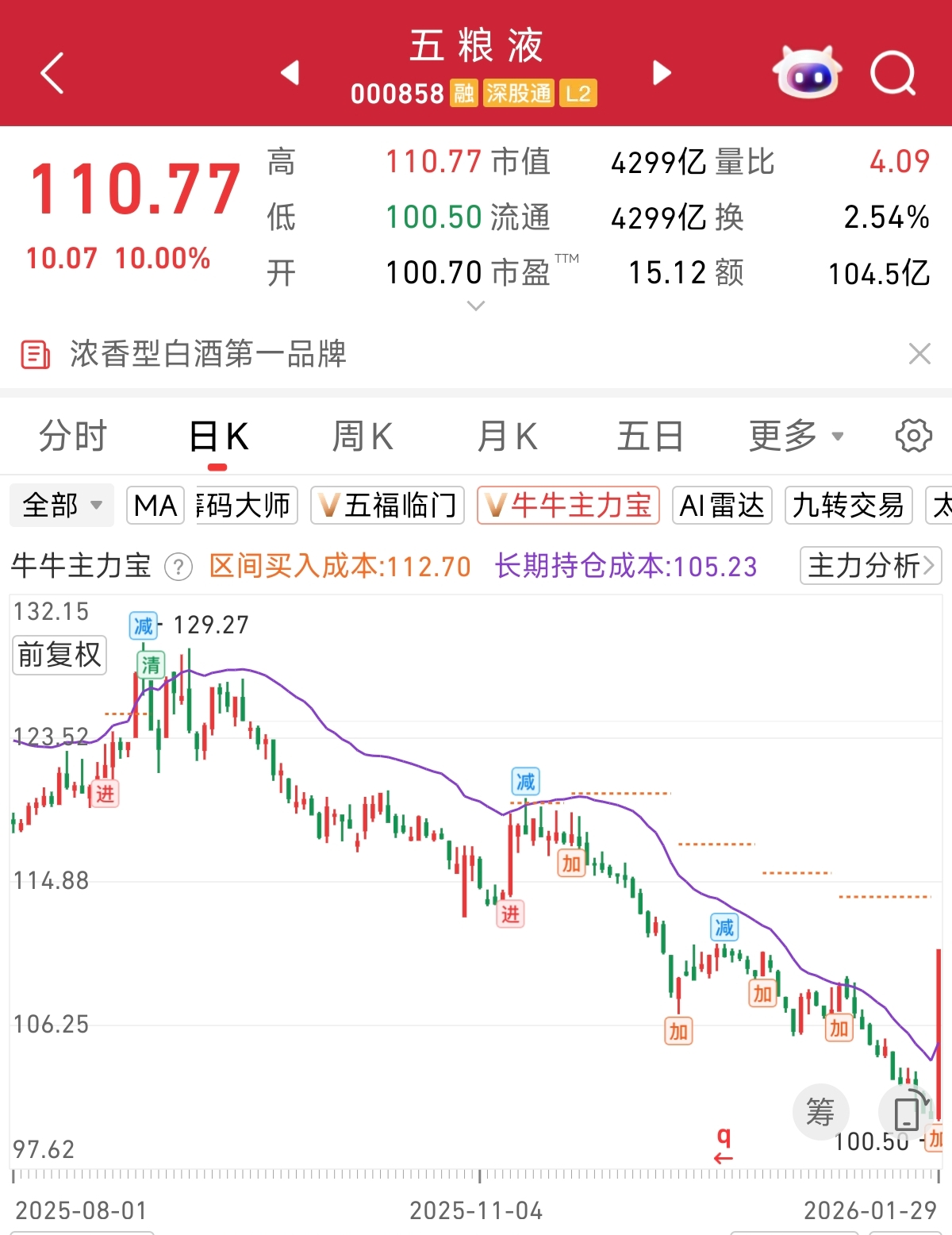 根据“主力宝”监控,今日大涨的五粮液,在25年8月份出现主力进场信号后,随着市场一路下跌不断出现主力加仓减仓的信号,今日大涨后,依然低于主力的区间买入成本。